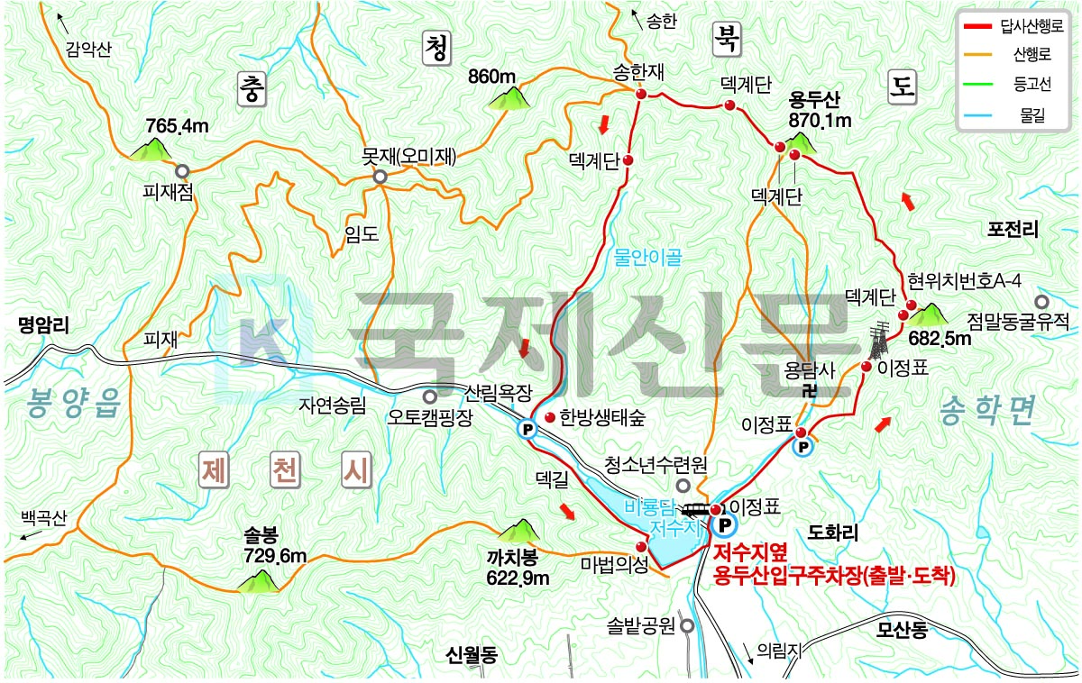 Á¦Ãµ ½Ã¹ÎÀº ÁÂ¿ì »ê±æ¿¡¼­ ÇÑÂÊ ¹æÇâÀ¸·Î ¿Ã¶ó Á¤»óÀ» Âï°í ¶Ç ´Ù¸¥ ¹æÇâÀ¸·Î ÇÏ»êÇÏ´Â ¿øÁ¡È¸±Í ÄÚ½º·Î ¸¹ÀÌ ÀÌ¿ëÇÑ´Ù. °Å¸®´Â ÀÌÁ¤Ç¥ ±âÁØ ¾à 4.78§°¿¡ 2½Ã°£30ºÐ Á¤µµ¸é »êÇàÀ» ¸¶Ä¡´Â ¸¸Å­ µî»ê°´°ú °¡Á· »êÇà°´ÀÌ ºÕºó´Ù. ¡®Á¦ÃµÀÇ ±ÝÁ¤»ê¡¯À̶ó ÇÒ ¸¸Çß´Ù.