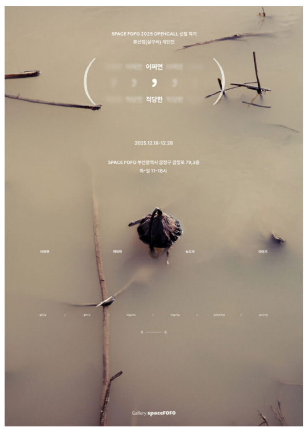 °¶·¯¸® ½ºÆäÀ̽ºÆ÷Æ÷(SPACE FOFO¡¤ºÎ»ê ±ÝÁ¤±¸ ÀåÀüµ¿)´Â 2025³âÀÇ ¸¶Áö¸· Àü½Ã·Î »çÁøÀÛ°¡ ·ù¼±Á¤(»ì±¸¾¾)ÀÇ °³ÀÎÀü ¡®¾î¼¸é, Àû´çÇÑ¡¯À» ¿À´Â 28ÀϱîÁö °³ÃÖÇÑ´Ù. À̹ø Àü½Ã´Â ½ºÆäÀ̽ºÆ÷Æ÷ÀÇ ¿¬¸»À» ¸¶¹«¸®ÇÏ´Â Àü½ÃÀÌÀÚ, »ì±¸¾¾ ÀÛ°¡ÀÇ 2025³â ¸¶Áö¸· °³ÀÎÀüÀ¸·Î, ÇÑ ÇØÀÇ ³¡ÀÚ¶ô¿¡ »î°ú °¨Á¤ÀÇ ±ÕÇüÀ» µÇµ¹¾Æº¸°Ô ÇÏ´Â ÀÚ¸®´Ù.