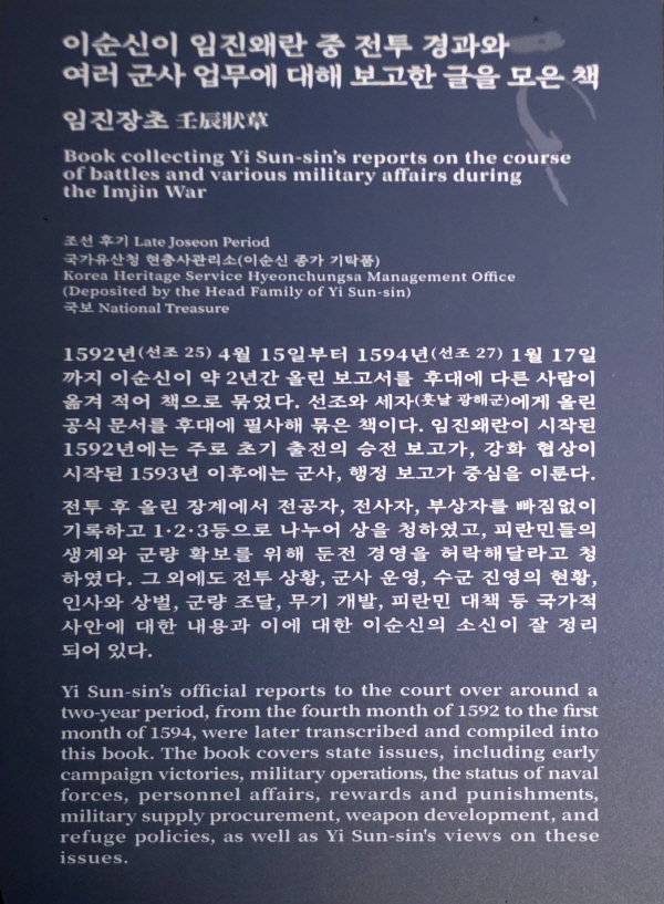 ÀÓÁøÀåÃÊ´Â À̼ø½Å À屺ÀÌ ÀÓÁø¿Ö¶õ Áß ÁÖ¿ä ÀüÅõÀÇ ÃâÀü °æ°ú ¹× Àü°ú¿¡ ´ëÇØ º¸°íÇÑ °ÍÀ» ºñ·ÔÇÏ¿© ¿Ö±ºÀÇ Á¤¼¼, ±º»ç»óÀÇ °ÇÀÇ, ¼ö±º Áø¿µÀÇ ÇöȲ µî¿¡ ´ëÇØ Á¶Á¤¿¡ Àå°èÇÑ ³»¿ëÀ» ¡®°èº»µî·Ï¡¯ÀÇ ¿¹¿¡ µû¶ó ´Ù¸¥ »ç¶÷ÀÌ ¿Å°Ü ÀûÀº °ÍÀÌ´Ù. ÀÌ À屺ÀÇ Ä£ÇÊÀº ¾Æ´ÏÁö¸¸ ÀÓÁø¿Ö¶õ°ú Ãæ¹«°øÀ» ¿¬±¸ÇÏ´Â ÇÙ½É »ç·á·Î ¼Õ²ÅÈù´Ù. ¡®³ÁßÀϱâ ÃÊ°í¡¯¿Í ÇÔ²² ±¹º¸·Î ÁöÁ¤µÅ ÇöÃæ»ç¿¡¼ º¸Á¸ÇÑ´Ù.