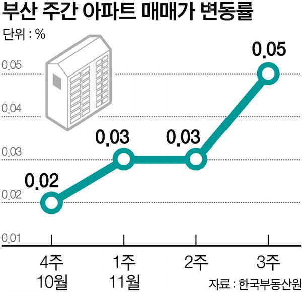 ºÎ»ê ¾ÆÆÄÆ® ¸Å¸Å°¡°¡ 4ÁÖ ¿¬¼Ó »ó½ÂÇϸç ȸº¹¼¼°¡ Á¡Á¡ ¶Ñ·ÇÇØÁö°í ÀÖ´Ù. µ¿ºÎ»ê±Ç¿¡¼ ½ÃÀÛµÈ Áö¿ª ºÎµ¿»ê ½ÃÀåÀÇ ¿Â±â°¡ ¼ºÎ»ê±îÁö ¼¼È÷ ¹øÁ®°¡´Â ¾ç»óÀÌ¾î¼ ÇâÈÄ ÃßÀÌ¿¡ °ü½ÉÀÌ ½ò¸°´Ù.