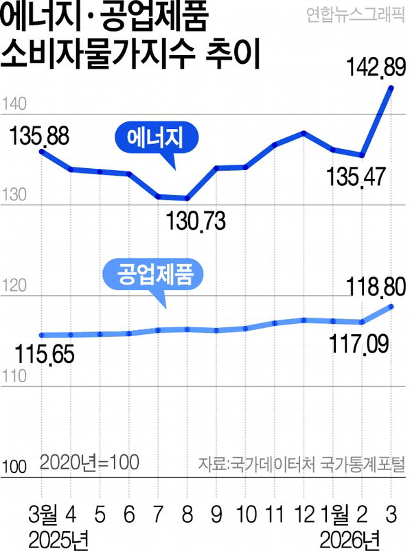 5ÀÏ ±¹°¡µ¥ÀÌÅÍóÀÇ ±¹°¡Åë°èÆ÷ÅÐ(KOSIS)°ú ¡®2026³â 3¿ù ¼ÒºñÀÚ¹°°¡ µ¿Ç⡯ ÀڷḦ º¸¸é Áö³´Þ Àü±¹ÀÇ °ø¾÷Á¦Ç° ¹°°¡ Áö¼ö´Â 118.80(2020³â=100)À¸·Î Áý°èµÆ´Ù. ÀÌ´Â °ü·Ã Åë°è°¡ ½ÃÀÛµÈ 1985³â 1¿ù ÀÌÈÄ ¸ðµç ´ÞÀ» ÅëÆ²¾î °¡Àå ³ôÀº ¼öÄ¡´Ù. Áö³ÇØ 3¿ù(115.65)°ú ºñ±³Çϸé 2.7% »ó½ÂÇß´Ù. ÀÌ »ó½Â·üÀº 2023³â 10¿ù(3.6%) ÀÌÈÄ 29°³¿ù ¸¸ÀÇ ÃÖ°íÄ¡´Ù.