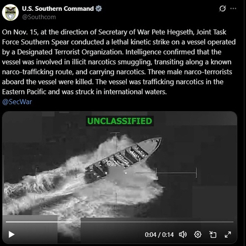 ¹Ì ³²ºÎ»ç·ÉºÎ(SOUTHCOM)´Â 16ÀÏ(ÇöÁö½Ã°£) ¿¢½º(X¡¤¿¾ Æ®À§ÅÍ) °èÁ¤¿¡ ¡°ÇÇÆ® Çì±×¼¼½º ÀüÀïºÎ(±¹¹æºÎ) Àå°üÀÇ Áö½Ã¿¡ µû¶ó 11¿ù 15ÀÏ ÇÕµ¿ ŽºÅ©Æ÷½º ¡®¼´ø ½ºÇǾ(Southern Spear)´Â ÁöÁ¤ Å×·¯ Á¶Á÷(DTO)ÀÌ ¿î¿µÇÏ´Â ¼±¹Ú¿¡ ´ëÇØ Ä¡¸íÀûÀÎ ¹°¸®Àû °ø°ÝÀ» ¼öÇàÇß´Ù¡±°í ¹àÇû´Ù. ÀÌ¾î ¡°Á¤º¸´ç±¹Àº ÇØ´ç ¼±¹ÚÀÌ ºÒ¹ý ¸¶¾à¹Ð¼ö¿¡ ¿¬·çµÅ ÀÖÀ¸¸ç, ¾Ë·ÁÁø ¸¶¾à ¹Ð¸Å °æ·Î¸¦ µû¶ó À̵¿ ÁßÀ̾ú°í, ¸¶¾àÀ» ¿î¹Ý ÁßÀ̶ó°í È®ÀÎÇß´Ù¡±°í µ¡ºÙ¿´´Ù.