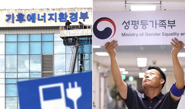 30ÀÏ Á¤ºÎÁ¶Á÷¹ý °³Á¤¾ÈÀÌ ±¹¹«È¸ÀÇ¿¡¼ ÀǰáµÇ¸é¼ 1ÀϺÎÅÍ È¯°æºÎ°¡ ±âÈÄ¿¡³ÊÁöȯ°æºÎ·Î, ¿©¼º°¡Á·ºÎ°¡ ¼ºÆòµî°¡Á·ºÎ·Î °¢°¢ È®´ë °³ÆíµÈ´Ù. »çÁøÀº À̳¯ Á¤ºÎ¼¼Á¾Ã»»ç ¿Üº®¿¡¼ ±âÈÄ¿¡³ÊÁöȯ°æºÎ ÇöÆÇÀ» ¼³Ä¡ÇÏ´Â ¸ð½À(¿ÞÂÊ)°ú Á¤ºÎ¼¿ïû»ç¿¡¼ ¼ºÆòµî°¡Á·ºÎ ÇöÆÇÀ» ¼³Ä¡ÇÏ´Â ¸ð½À. ¿¬ÇÕ´º½º