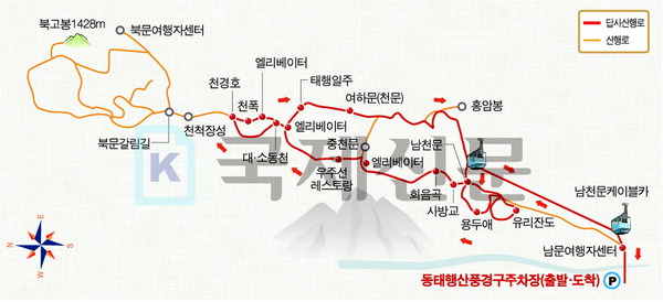 µ¿ÅÂÇà»ê dz°æ±¸ ÁÖÂ÷Àå¿¡¼ Ãâ¹ßÇÑ´Ù. ÇÏõ¿¡ ³õÀÎ ´Ù¸®¸¦ °Ç³Ê ¿©ÇàÀÚ¼¾ÅÍ¿¡¼ ³²Ãµ¹® ÄÉÀ̺íÄ«·Î À̵¿ÇÑ µÚ ÄÉÀ̺íÄ« »óºÎ½Â°Àå¿¡¼ ³»¸°´Ù. ¿ÞÂÊÀ̸ç À¯¸® Àܵµ±îÁö ¾à 600£í ¶³¾îÁ³´Ù. ¿À¸¥ÂÊ ±æÀº ÅÂÇàÀÏÁÖ(÷¼ú¼ìéñº)¿¡¼ ¿À´Â ÃëÀçÆÀÀÇ ÇÏ»ê±æÀÌ´Ù. ³²Ãµ¹® ÀÔ±¸ °¥¸²±æ¿¡¼ Á÷ÁøÇü ¿ÞÂÊ À¯¸®Àܵµ ¹æÇâÀ¸·Î °£´Ù.