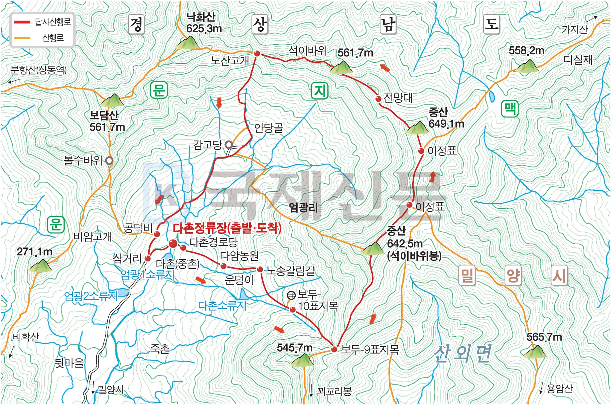 ¹Ð¾ç »ê¿Ü¸é Áß»ê »êÇà °æ·Î´Â ´ÙÀ½°ú °°´Ù. ¾ö±¤¸® ´ÙÃ̸¶À» ¹ö½ºÁ¾Á¡~´ÙÃ̰æ·Îȸ°ü~´Ù¾Ï³ó¿ø ÀÔ±¸~³ë¼Û °¥¸²±æ~¹¬Àº ÀÓµµ °¥¸²±æ~¡®ÇöÀ§Ä¡¹øÈ£ ¹Ð¾ç º¸µÎ-10¡¯ Ç¥Áö¸ñ~ ¡®ÇöÀ§Ä¡ ¹øÈ£ ¹Ð¾ç º¸µÎ-9¡¯ Ç¥Áö¸ñ ´É¼± ¾ÈºÎ~Áß»ê(¸¶À»¿¡¼ º¸´Â Á¤»ó¡¤¼®À̹ÙÀ§ºÀ)~Á߻ꡤ¿ë¾Ï»ê °¥¸²±æ~Èñ°î¸® °¥¸²±æ(¿î¹®Áö¸Æ ÇÕ·ù)~Áß»ê(ÁöÇüµµ»ó Á¤»ó)~¼®À̹ÙÀ§~³ë»ê °í°³~¾È´ç°ñ~°ø´öºñ~´ÙÃ̸¶À» ¹ö½ºÁ¾Á¡À¸·Î µÇµ¹¾Æ¿À´Â ¿øÁ¡È¸±Í ÄÚ½ºÀÌ´Ù. »êÇà °Å¸®´Â ¾à 7.5§°À̸ç, 4½Ã°£20ºÐ ¾ÈÆÆ °É¸°´Ù. ¡®ÇöÀ§Ä¡¹øÈ£ º¸µÎ-9¡¯ Ç¥Áö¸ñÀÌ ÀÖ´Â Áß»ê ´É¼± ¾ÈºÎ °¥¸²±æ±îÁö »ê±æÀÌ ¶Ñ·ÇÇÏÁö ¾Ê¾Æ À¯ÀÇÇØ¾ß ÇÑ´Ù.