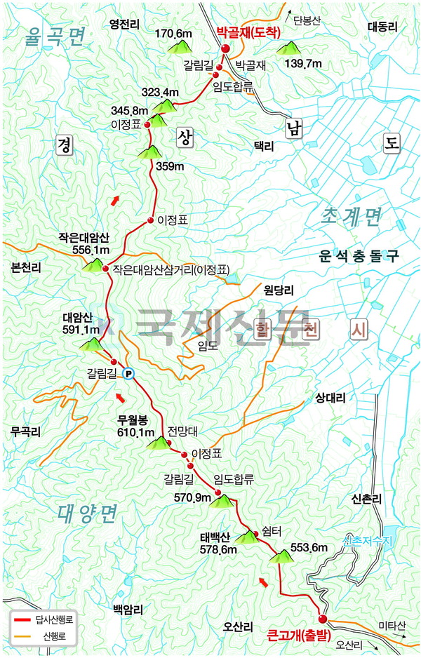 ÇÕõ±º Ãʰè¸é ½ÅÃ̸®¿Í ´ë¾ç¸é ¿À»ê¸® °æ°èÀÎ ¡®Å«°í°³¡¯¿¡¼ Ãâ¹ßÇÑ´Ù. ¹ÌŸ»ê µî»ê ¾È³»µµ¿Í ¿î¼® Ãæµ¹±¸ ޹æ¾È³»µµ°¡ ÀÖ´Ù. µ¿ÂÊ ³ª¹µ°¡Áö »çÀÌ·Î Ãʰè¸éÀÇ ¿î¼® Ãæµ¹±¸¸¦ º¸¸ç »êÇàÀº ¿ÞÂÊ ´É¼±À» Ÿ°í ´ë¾Ï»ê(4.3§°)À¸·Î ÇâÇÑ´Ù. ¿À¸¥ÂÊÀº ¹ÌŸ»ê ¹æÇâÀ̸ç, ÃëÀçÆÀÀÌ ¡®¿î¼® Ãæµ¹±¸ ȯÁ¾ÁÖ ¨é ¹ÌŸ»ê~õȲ»ê¡¯ ±¸°£À» Å» ¶§ Å«°í°³·Î µÇµ¹¾Æ¿À´Â »ê±æÀÌ´Ù. ¾ßÀÚ¸ÅÆ®°¡ ±ò¸° ³Ê¸¥ ±æÀ» °È´Â´Ù. ½Ì±×·¯¿î °¡À» Çâ±â¸¦ ¸ÃÀ¸¸ç Âü³ª¹«¿Í ¾Æ¸§µå¸® ¼Ò³ª¹«°¡ ´Ã¾î¼± ½£±æÀ» °È´Â ±æÀº ¹ß°ÉÀ½ÀÌ °¡º±´Ù.