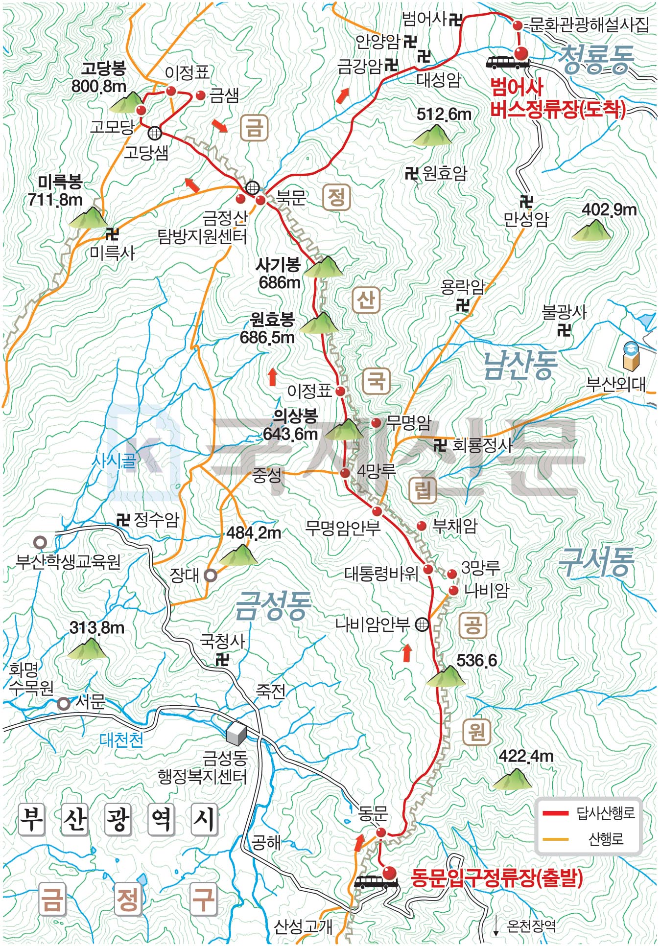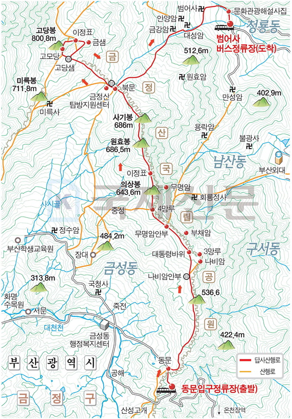 ºÎ»êµµ½Ãöµµ 1È£¼± ¿ÂõÀ忪 ¸ÂÀºÆí ¿ÂõÀ忪 ¹ö½ºÁ¤·ùÀå¿¡¼ 203¹ø Á¼®¹ö½º¸¦ Ÿ°í ÇØ¹ß ¾à 380£í ³ôÀÌÀÎ µ¿¹® ÀÔ±¸ ¹ö½ºÁ¤·ùÀå¿¡¼ ³»¸°´Ù. »êºÒÁ¶½ÉÀ» ¾Ë¸®´Â ÃâÀÔ±¸¸¦ Åë°úÇÏ¸é ¹Ù·Î »êÇàÀ» ½ÃÀÛÇÑ´Ù. ¡®°¥¸Ë±æ 700¸® 7ÄÚ½º ¡¯À» ¾Ë¸®´Â ¾È³»ÆÇÀÌ ÀÖ´Ù. »êÇàÀº °í´çºÀ Á¤»ó µîÁ¤À» Á¦¿ÜÇÏ°í ¹ü¾î»ç±îÁö °¥¸Ë±æ 7ÄÚ½º¿Í °ãÄ£´Ù. ¾Æ½ºÆÈÆ® Æ÷À屿Àº Èë±æ·Î ¹Ù²î°í ¾à 5ºÐÀÌ¸é µ¿¹®À» ºüÁ®³ª°£´Ù. ¿©±â¼ ¿À¸¥ÂÊ 3¸Á·ç(1.7§°)¡¤ºÏ¹®(3.8§°)À¸·Î ²ª´Â´Ù. ¿ÞÂÊÀº ³²¹® ÀÔ±¸ÀÎ »ê¼º°í°³¿¡¼ ¿À´Â ±æÀ̸ç Á÷ÁøÀº »ê¼º¸¶À»·Î ¹Ù·Î °£´Ù.
