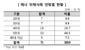¼ºº°·Î´Â ¿©¼ºÀÌ 98°Ç(90.7%)À¸·Î ´ëºÎºÐÀ̾úÀ¸¸ç, ¿¬·É´ë(¿¬·É È®Àΰ¡´ÉÇÑ 71°Ç ´ë»ó)´Â 40´ë~50´ë ÁßÀå³âÃþÀÌ 52°ÇÀ¸·Î ÀüüÀÇ 73.2%¸¦ Â÷ÁöÇß´Ù.
