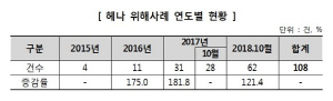 Çѱ¹¼ÒºñÀÚ¿ø(¿øÀå ÀÌÈñ¼÷)¿¡ µû¸£¸é ÃÖ±Ù 3³â 10°³¿ù°£(2015.1¡2018.10) ¼ÒºñÀÚÀ§Çذ¨½Ã½Ã½ºÅÛ(CISS)¿¡ Á¢¼öµÈ Ç쳪 °ü·Ã À§ÇØ»ç·Ê´Â ÃÑ 108°ÇÀ¸·Î, 2018³â 10¿ù±îÁö 62°Ç¿¡ À̸¦ Á¤µµ·Î ±ÞÁõ¼¼¸¦ º¸À̰í ÀÖ´Ù.