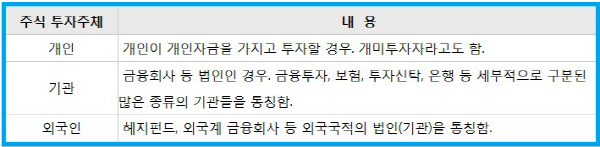 ÁֽĽÃÀå¿¡¼´Â ÅõÀÚÁÖü¸¦ Å©°Ô 3°¡Áö·Î ºÐ·ùÇϰí ÀÖ´Ù. ¼ÒÀ§ °³ÀÎ, ±â°ü, ¿ÜÀÎ(¿Ü±¹ÀÎ)ÀÌ´Ù.