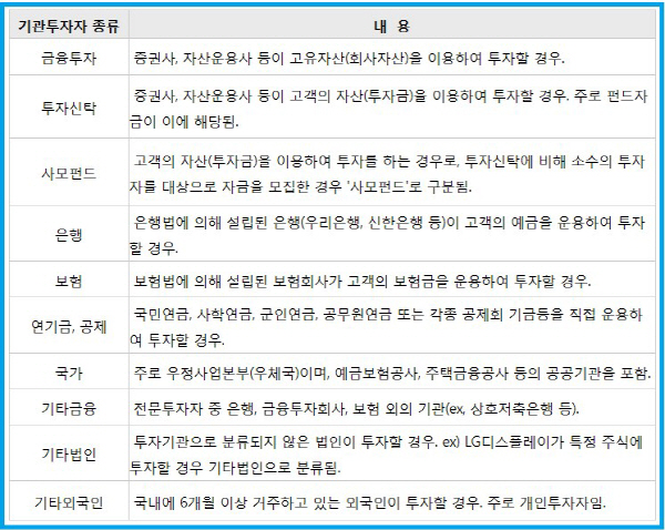 ¡®±¹°¡¡¯´Â ´ëºÎºÐÀÇ °æ¿ì ¿ìÁ¤»ç¾÷º»ºÎ(¿ìü±¹)ÀÌ¸ç ±×¹Û¿¡ ¿¹±Ýº¸Çè°ø»ç, ÁÖÅñÝÀ¶°ø»ç µîÀÇ °ø°ø±â°üÀ» ¶æÇÑ´Ù. ¡®±âŸ±ÝÀ¶¡¯À̶õ Àü¹®ÅõÀÚÀÚ Áß ÀºÇà, ±ÝÀ¶ÅõÀÚȸ»ç, º¸Çè ¿ÜÀÇ ±â°üÀ» ¸»ÇÏ¸ç º¸Åë »óÈ£ÀúÃàÀºÇà µîÀ» ÀǹÌÇÑ´Ù. ¡®±âŸ¹ýÀΡ¯Àº ÅõÀÚ±â°üÀ¸·Î ºÐ·ùµÇÁö ¾ÊÀº ¹ýÀÎÀÌ ÅõÀÚÇÏ´Â °æ¿ì·Î ¿¹¸¦ µé¸é Çö´ëÂ÷°¡ ƯÁ¤ ÁֽĿ¡ ÅõÀÚÇÒ °æ¿ì ±âŸ¹ýÀÎÀ¸·Î ºÐ·ùµÈ´Ù. ±â¾÷ÀÌ ÀÚ»çÁÖ¸¦ ¸ÅÀÔÇÑ °æ¿ì¿¡µµ ¿ª½Ã ±âŸ¹ýÀÎÀ¸·Î ÀâÈù´Ù.