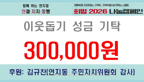 ºÎ»êÁø±¸ ¿¬Áöµ¿ ÁÖ¹ÎÀÚÄ¡À§¿øÈ¸ °¨»ç ±è±ÔÂùÀº Áö³ 12ÀÏ, ¿¬Áöµ¿ Áֹμ¾ÅÍ(µ¿Àå ¹Ú¹Ì¿Á)¿¡ ¡®Èñ¸Á 2026 ³ª´®Ä·ÆäÀΡ¯ ¼º±Ý 30¸¸ ¿øÀ» ±âŹÇß´Ù.