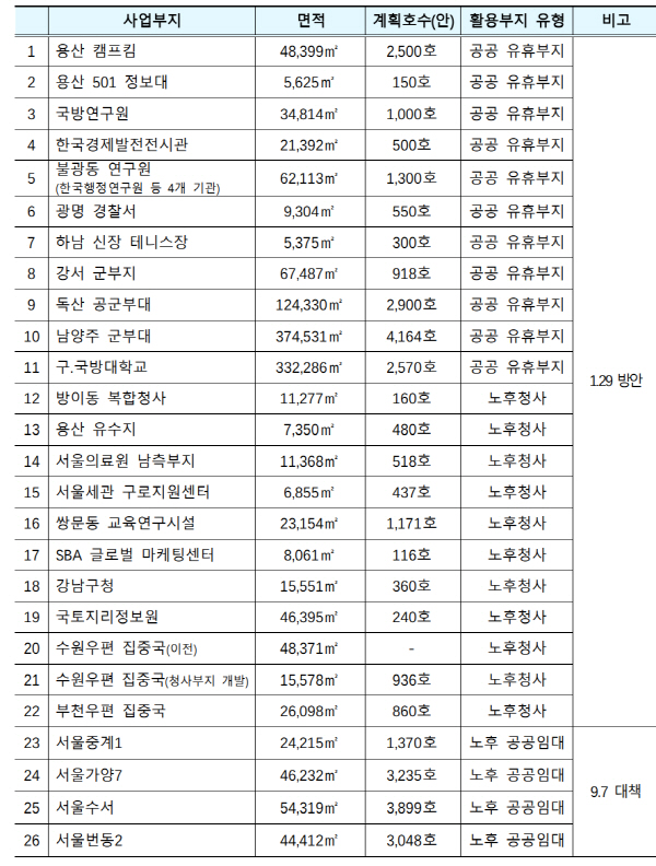 ÀçÁ¤°æÁ¦ºÎ¿Í ±¹Åä±³ÅëºÎ´Â 28ÀÏ ¿­¸° ±¹¹«È¸ÀÇ¿¡¼­ °ø°øÁÖÅà 3¸¸4000°¡±¸¸¦ °Ç¼³ÇÑ´Ù´Â °èȹÀ» ¡®±¹°¡ Á¤Ã¥»ç¾÷¡¯À¸·Î ÀǰáÇß´Ù. Áö³­ÇØ 9¿ù 7ÀÏ ³ª¿Â ¡®ÁÖÅà °ø±Þ È®´ë ¹æ¾È¡¯°ú ¿ÃÇØ 1¿ù 29ÀÏ ¹ßÇ¥µÈ ¡®µµ½É ÁÖÅà °ø±Þ È®´ë ¹× ½Å¼ÓÈ­ ¹æ¾È¡¯ÀÇ ÈÄ¼Ó Á¶Ä¡´Ù. ´ë»óÁö´Â 26°÷ÀÌ´Ù. ¼¼ºÎÀûÀ¸·Î´Â ¿ë»ê Ä·ÇÁÅ´¡¤±¹¹æ¿¬±¸¿ø¡¤µ¶»ê°ø±ººÎ´ë µî °ø°øÀ¯ÈÞºÎÁö 11°÷, ¹æÀ̵¿ º¹ÇÕû»ç¡¤¼ö¿ø¿ìÆíÁýÁß±¹ µî ³ëÈÄ Ã»»ç 11°÷, ¼­¿ï °¡¾ç7±¸¿ª µî ³ëÈÄ °ø°øÀÓ´ë 4°÷ µîÀÌ´Ù.