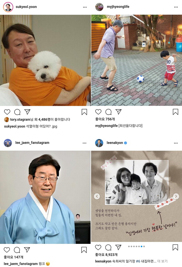| ¿©¾ß ´ë±ÇÁÖÀÚµéÀÌ ÀÏ»óÀ» °øÀ¯ÇÏ°í ±¹¹Î¿¡°Ô º¸´Ù Ä£±ÙÇÏ°Ô ´Ù°¡°¡±â À§ÇØ SNS¸¦ Àû±Ø Ȱ¿ëÇϰí ÀÖ´Ù. À§ ¿ÞÂʺÎÅÍ ¹Ý·Á°ß°ú ÇÔ²² ÇÑ ÀÏ»óÀ» °øÀ¯ÇÑ ±¹¹ÎÀÇÈû À±¼®¿ Èĺ¸, ¼ÕÀÚ¿Í ³ë´Â »çÁøÀ» °ÔÀçÇÑ ±¹¹ÎÀÇÈû ÃÖÀçÇü Èĺ¸, ¾Æ·¡ ¿ÞÂʺÎÅÍ ÇѺ¹ Â÷¸²À¸·Î À®Å©ÇÏ´Â ¡®¼¿Ä«¡¯¸¦ ¿Ã¸° ´õºÒ¾î¹ÎÁÖ´ç ÀÌÀç¸í Èĺ¸, °¡Á·°ú ÇÔ²²ÇÑ Ãß¾ïÀ» °øÀ¯ÇÑ ¹ÎÁÖ´ç À̳«¿¬ Èĺ¸. °¢ Èĺ¸ ÀνºÅ¸±×·¥ ĸó |