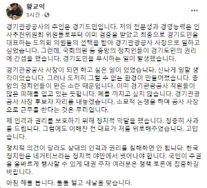 Ȳ ¾¾´Â À̳¯ ÆäÀ̽ººÏÀ» ÅëÇØ ¡°°æ±â°ü±¤°ø»ç »çÀå Èĺ¸ÀÚ ÀÚ¸®¸¦ ³»³õ°Ú´Ù. ¼Ò¸ðÀû ³íÀïÀ» ÇÏ¸ç °ø»ç »çÀåÀ¸·Î ±Ù¹«¸¦ ÇÑ´Ù´Â °ÍÀº ¹«¸®¡±¶ó°í ¹àÇû´Ù.