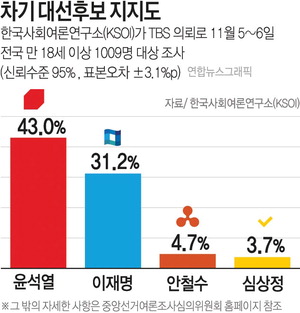 Çѱ¹»çȸ¿©·Ð¿¬±¸¼Ò(KSOI)°¡ TBS ÀÇ·Ú·Î Áö³ 5, 6ÀÏ Àü±¹ 18¼¼ ÀÌ»ó 1009¸íÀ» ´ë»óÀ¸·Î Á¶»çÇÑ °á°ú À± È帴 43.0%, ÀÌ È帴 31.2%¸¦ °¢°¢ ±â·ÏÇß´Ù. µÎ Èĺ¸ÀÇ °ÝÂ÷´Â 11.8%Æ÷ÀÎÆ®·Î ¿ÀÂ÷¹üÀ§ ¹ÛÀÌ´Ù. ÀÌ¾î ±¹¹ÎÀÇ´ç ¾Èö¼ö È帴 4.7%, Á¤ÀÇ´ç ½É»óÁ¤ Èĺ¸ 3.7%, ±èµ¿¿¬ Àü °æÁ¦ºÎÃѸ® 1.4% ¼øÀ̾ú´Ù. À± Èĺ¸ÀÇ ÁöÁöµµ´Â ÀüÁÖ Á¶»çº¸´Ù 10.6%Æ÷ÀÎÆ® »ó½ÂÇÑ °ÍÀÌ´Ù. ¹Ý¸é ÀÌ È帴 °°Àº ±â°£ 2.0%Æ÷ÀÎÆ® ³»·È´Ù. À̹ø Á¶»ç´Â À± Èĺ¸ ¼±Ãâ ÈÄ Ã¹ Á¶»ç´Ù. °¡»ó ¾çÀÚ ´ë°á ±¸µµ¿¡¼µµ À± È帴 47.3%·Î ÀÌ Èĺ¸(35.2%)¸¦ ¾Õ¼¹´Ù. µÎ Èĺ¸ÀÇ °ÝÂ÷´Â 12.1%Æ÷ÀÎÆ®´Ù.