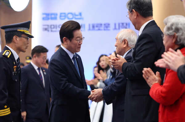 ÀÌÀç¸í ´ëÅë·ÉÀÌ 21ÀÏ ¼¿ï ¼´ë¹®±¸ °æÂûû¿¡¼ ¿¸° 80Áֳ⠰æÂûÀÇ ³¯ ±â³ä½Ä¿¡ ÀÔÀåÇÏ¸ç ¿ÃÇØÀÇ °æÂû¿µ¿õ °¡Á·µé°ú Àλ縦 Çϰí ÀÖ´Ù. 2025.10.21 ¿¬ÇÕ´º½º