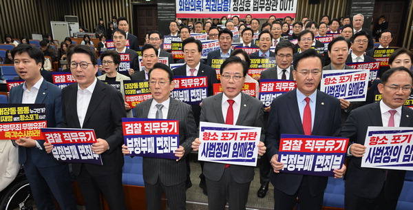 ±¹¹ÎÀÇÈû ÀÇ¿øµéÀÌ 10ÀÏ ±¹È¸¿¡¼­ ¿­¸° ÀÇ¿øÃÑȸ¿¡¼­ °ËÂûÀÇ ¡®´ëÀ嵿 »ç°Ç¡¯ Ç×¼Ò Æ÷±â¸¦ ±ÔźÇÏ´Â ±¸È£¸¦ ¿ÜÄ¡´Â ¸ð½À. ±èÁ¤·Ï ±âÀÚ ilro12@kookje.co.kr
