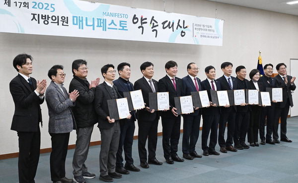 ºÎ»ê½ÃÀÇȸ ÀÇ¿ø 17¸íÀÌ ÁֹΰúÀÇ ¾à¼ÓÀ» ÁöŰ°í ¿ì¼öÇÑ Á¶·Ê¸¦ ¸¸µç °ø·Î¸¦ ÀÎÁ¤¹Þ¾Æ ¡®¸Å´ÏÆä½ºÅä ¾à¼Ó´ë»ó¡¯À» ¼ö»óÇß´Ù.