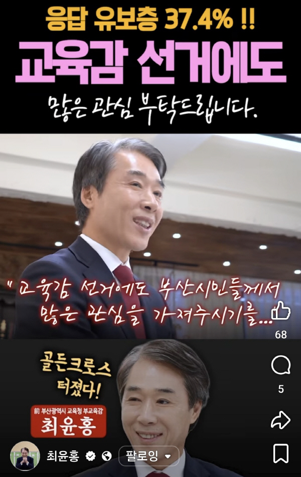 ºÎ»ê½Ã ¼±°Å°ü¸®À§¿øÈ¸´Â ÃÖÀ±È« Àü ºÎ±³À°°¨¿¡°Ô °øÁ÷¼±°Å¹ý Á¦108Á¶ 6Ç×À» À§¹ÝÇØ ±¸µÎ °æ°í¸¦ Çß´Ù°í 22ÀÏ ¹àÇû´Ù. ÃÖ Àü ºÎ±³À°°¨Àº SNS¿¡ ´ë´ã Çü½ÄÀÇ µ¿¿µ»óÀ» ¿Ã·È´Ù. ÇØ´ç °Ô½Ã¹°¿¡´Â ¾ð·Ð»ç°¡ ÁøÇàÇÑ Â÷±â ±³À°°¨ ¿©·ÐÁ¶»ç ¼öÄ¡ ÀϺΰ¡ ÀοëµÅ ÀÖ¾ú´Ù. ¶ÇÇÑ ¡®°ñµçÅ©·Î½º ÅÍÁ³´Ù!¡¯¶ó´Â ¹®±¸µµ Æ÷ÇԵŠÀÖ¾ú´Ù.