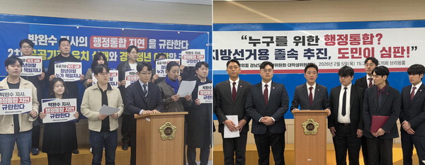 ´õºÒ¾î¹ÎÁÖ´ç°ú ±¹¹ÎÀÇÈû °æ³²µµ´ç û³âÀ§¿øÈ¸°¡ 5ÀÏ °¢°¢ °æ³²µµÀÇȸ¿¡¼­ ºÎ»ê°úÀÇ ÇàÁ¤ÅëÇÕ ÀÔÀåÀ» ¹àÈ÷°í ÀÖ´Ù. ¹ÎÁÖ´ç û³âÀ§´Â ¡®¹Ú¿Ï¼ö Áö»ç, ÇàÁ¤ÅëÇÕ Áö¿¬ ±ÔźÇÑ´Ù¡¯ ¡®°ø°ø±â°ü À¯Ä¡ ½ÇÆÐ, û³âÀÌÅ» ´©°¡ Ã¥ÀÓÁö³ª¡¯´Â ¼ÕÆÖ¸»À» µé¾ú°í, ±¹¹ÎÀÇÈû û³âÀ§´Â ¡®´©±¼ À§ÇÑ ÇàÁ¤ÅëÇÕ. Áö¹æ¼±°Å¿ë Á¹¼Ó ÃßÁø, µµ¹ÎÀÌ ½ÉÆÇ¡¯À̶ó´Â Çö¼ö¸·À» ³»°É¾ú´Ù. ±è¿ë±¸ ±âÀÚ