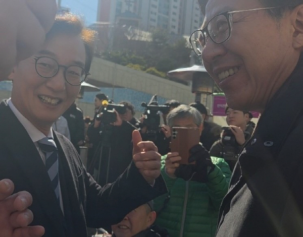 ÀüÀç¼ö(¿ÞÂÊ¡¤ºÏ°©) ±¹È¸ÀÇ¿ø°ú ¹ÚÇüÁØ ºÎ»ê½ÃÀåÀÌ 9ÀÏ ´ë½Éµµ °³Åë½Ä¿¡¼­ ¸¸³ª ÀλçÇϰí ÀÖ´Ù.
