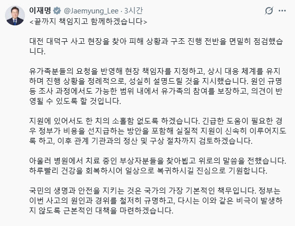 ÀÌ ´ëÅë·ÉÀº 21ÀÏ ´ëÀü È­Àç ÇöÀåÀ» ¹æ¹®ÇÑ Á÷ÈÄ ¿¢½º(X¡¤¿¾ Æ®À§ÅÍ)¿¡ ¡®³¡±îÁö Ã¥ÀÓÁö°í ÇÔ²² Çϰڴ١¯´Â Á¦¸ñÀÇ ±ÛÀ» ¿Ã¸®°í ¡°±¹¹ÎÀÇ »ý¸í°ú ¾ÈÀüÀ» ÁöŰ´Â °ÍÀº ±¹°¡ÀÇ °¡Àå ±âº»ÀûÀΠ幫¡±¶ó¸ç À̰°ÀÌ ¸»Çß´Ù.