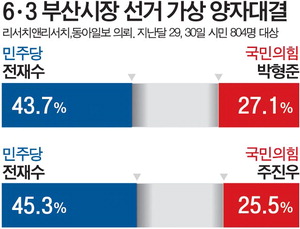 6¡¤3 Áö¹æ¼±°ÅÀÇ ½ÂºÎó·Î ¶°¿À¸¥ ºÎ»ê½ÃÀå ¼±°Å¿¡¼­ ´õºÒ¾î¹ÎÁÖ´ç ÀüÀç¼ö(ºÏ°©) ÀÇ¿øÀÌ ±¹¹ÎÀÇÈû °æ¼± ÁÖÀÚµé°úÀÇ °¡»ó ¾çÀÚ ´ë°á¿¡¼­ 15%Æ÷ÀÎÆ® ÀÌ»ó ¾Õ¼±´Ù´Â ¿©·ÐÁ¶»ç °á°ú°¡ 1ÀÏ ³ª¿Ô´Ù. ¿©·ÐÁ¶»ç Àü¹®¾÷ü ¸®¼­Ä¡¾Ø¸®¼­Ä¡°¡ µ¿¾ÆÀϺ¸ÀÇ ÀÇ·Ú·Î Áö³­´Þ 29, 30ÀÏ ºÎ»ê ½Ã¹Î 804¸íÀ» ´ë»óÀ¸·Î ½Ç½ÃÇÑ ¿©·ÐÁ¶»ç¿¡¼­ Àü ÀÇ¿øÀÇ ÁöÁöÀ²Àº 43.7%·Î, ±¹¹ÎÀÇÈû ¼Ò¼Ó ¹ÚÇüÁØ ½ÃÀå(27.1%)º¸´Ù 16.6%p ¾Õ¼¹´Ù. Á¤´ç ÁöÁöµµ °ÝÂ÷ 8.1%p(¹ÎÁÖ´ç 41.5%, ±¹¹ÎÀÇÈû 33.4%)º¸´Ù ¾çÀÚ °£ °ÝÂ÷°¡ ´õ ÄÇ´Ù.