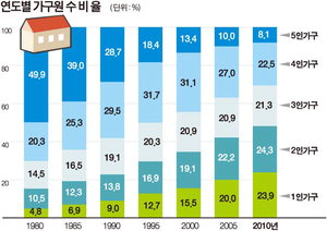 Æò±Õ °¡±¸¿ø ¼ö´Â ¢¹1980³â 4.62¸í ¢¹1990³â 3.77¸í ¢¹2000³â 3.12¸í ¢¹2005³â 2.88¸í ¢¹2010³â 2.69¸íÀ¸·Î °¨¼Ò¼¼¸¦ º¸À̰í ÀÖ´Ù. ºÎ»êÀÇ Æò±Õ °¡±¸¿ø ¼öµµ ¢¹1980³â 4.51¸í ¢¹1990³â 3.77¸í ¢¹2000³â 3.18¸í ¢¹2005³â 2.89¸í ¢¹2010³â 2.66¸íÀ» ±â·ÏÇß´Ù. ¿ï»êÀÇ Æò±Õ °¡±¸¿ø ¼ö´Â 2.79¸í, °æ³²Àº 2.62¸íÀ̾ú´Ù.