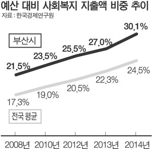 ºÎ»ê½ÃÀÇ °æ¿ì ¿¹»ê ´ëºñ »çȸº¹Áö ÁöÃâ¾× ºñÁßÀº 2008³â 21.5%¿¡¼ Áö³ÇØ 30.1%·Î 10%Æ÷ÀÎÆ® °¡±îÀÌ È®´ëµÆ´Ù. Àü±¹ Æò±Õ(2014³â)Àº 24.5%¿´´Ù. ÇѰ濬 Çã¿øÁ¦ ¿¬±¸À§¿øÀº "Áö¹æÁ¤ºÎÀÇ ÀçÁ¤ ºÎ´ãÀÌ ½ÉÈÇÑ °ÍÀº º¹ÁöÁ¤Ã¥ È®´ë°¡ ÁÖ¿ä ¿øÀÎ Áß Çϳª·Î ÀÛ¿ëÇ߱⠶§¹®"À̶ó¸ç "Áö¹æÀçÁ¤ÀÇ °ÇÀü¼ºÀ» È®º¸Çϱâ À§ÇØ È¿À²¼ºÀÌ ³ôÀº »ç¾÷ À§ÁÖ·Î º¹ÁöÁ¤Ã¥À» ÀçÆíÇÒ Çʿ䰡 ÀÖ´Ù"°í °Á¶Çß´Ù.