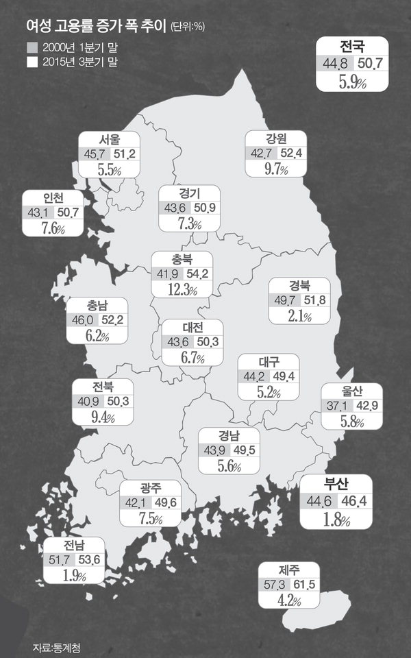 °æÁ¦È°µ¿ Àα¸ÀÇ Áõ°¡ ÆøÀÌ Á¦ÀÚ¸®°ÉÀ½ ¼öÁØ¿¡ ¸Ó¹°¸é¼ °í¿ë·ü ¿ª½Ã »ó½Â¼¼¸¦ ŸÁö ¸ø ÇÑ Ã¤ ÆòÇ༱¸¸ À¯ÁöÇß´Ù. 2000³â 1ºÐ±â ¸» 44.6%¿´´ø ºÎ»êÀÇ ¿©¼º °í¿ë·üÀº Áö³ÇØ 3ºÐ±â ¸» 46.4%·Î 1.8%Æ÷ÀÎÆ® ¿Ã¶ú´Ù. ÀÌ »ó½Â ÆøÀº Àü±¹ 16°³ ½Ã¡¤µµ Áß °¡Àå ³·Àº °ÍÀÌ´Ù. ÀÌ ±â°£ »ó½Â ÆøÀÌ °¡Àå ÄÇ´ø ÃæºÏ(12.3%Æ÷ÀÎÆ®)°ú ºñ±³Çϸé 10%Æ÷ÀÎÆ® ³Ñ°Ô Â÷À̰¡ ³µ´Ù. Àü±¹ Æò±ÕÀº 5.9%Æ÷ÀÎÆ®, ¼¿ïÀº 5.5%Æ÷ÀÎÆ®¿´´Ù.