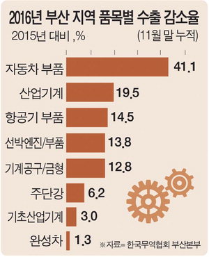 ºÎ»ê»ó°øÈ¸ÀÇ¼Ò µî¿¡ µû¸£¸é ÃÖ±Ù 5³â µ¿¾È ºÎ»ê Á¦Á¶¾÷üÀÇ ¼ö´Â Á¦ÀÚ¸®°ÉÀ½ ÁßÀÌ´Ù. ºÎ»êÀÇ ÃÑ»ê¾÷ Áß Á¦Á¶¾÷ ºñÁßÀº 2010³â 10.0%¿¡¼ 2014³â 10.4%·Î »ç½Ç»ó ±×´ë·Î´Ù. ÀÌ¿¡ µû¶ó Á¦Á¶¾÷ Áß½ÉÀÇ ¼öÃâ ¼ºÀå¼¼µµ ÇѰ踦 º¸À̰í ÀÖ´Ù. ÇѶ§ 30% ¼öÁرîÁö ¿Ã¶ó°¬´ø ºÎ»ê ¼öÃâÀÇ Àü±¹ ºñÁßÀº ÃÖ±Ù 5³â°£ 3%´ë¸¦ ¹þ¾î³ªÁö ¸øÇÏ´Â ½ÇÁ¤ÀÌ´Ù.