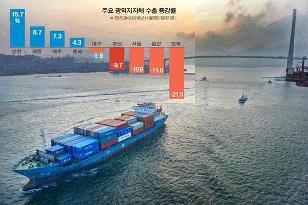 ºÎ»êÀÇ ÃÖ´ë ¼öÃâ±¹ÀÎ Áß±¹¿¡ ´ëÇÑ ¼öÃâ ºÎÁøµµ ¿øÀÎÀ¸·Î ²ÅÈù´Ù. ºÎ»êÀº ¿ÃÇØ 1~11¿ù ´ëÁß±¹ ¼öÃâ¾×ÀÌ 16¾ï5600¸¸ ´Þ·¯·Î, Áö³ÇØ °°Àº ±â°£º¸´Ù 17% °¨¼ÒÇß´Ù. ¶Ç ´Ù¸¥ ÁÖ¿ä ¼öÃâ±¹ÀÎ ¹Ì±¹°ú ÀϺ»¿¡ ´ëÇÑ ¼öÃâµµ Àü³â µ¿±â ´ëºñ °¢°¢ 3.9%¿Í 3.0% ÁÙ¾ú´Ù.
