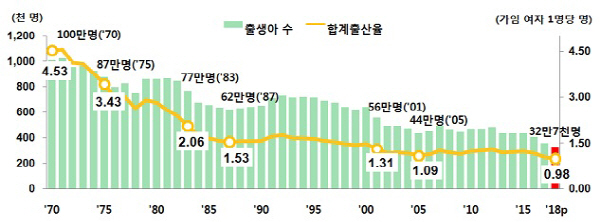 Åë°èûÀÌ 27ÀÏ ¹ßÇ¥ÇÑ ¡®2018³â Ãâ»ý¡¤»ç¸Á Åë°è(ÀáÁ¤)¡¯ ÀڷḦ º¸¸é Áö³ÇØ Àü±¹ÀÇ ÇÕ°èÃâ»êÀ²Àº 2017³â(1.05¸í)º¸´Ù 7.1% °¨¼ÒÇÑ 0.98¸íÀ» ±â·ÏÇß´Ù. ¿¬°£ ±âÁØ ÇÕ°èÃâ»êÀ²ÀÌ 1.0¸í ¹ØÀ¸·Î ³»·Á°£ °ÍÀº Ãâ»ý Åë°è¸¦ ÀÛ¼ºÇϱ⠽ÃÀÛÇÑ 1970³â ÀÌÈÄ Ã³À½ÀÌ´Ù. ¶Ç °æÁ¦Çù·Â°³¹ß±â±¸(OECD) 35°³ ȸ¿ø±¹ °¡¿îµ¥ ¿¬°£ ÇÕ°èÃâ»êÀ²ÀÌ 0¸í´ëÀÎ À¯ÀÏÇÑ ³ª¶ó°¡ µÆ´Ù.