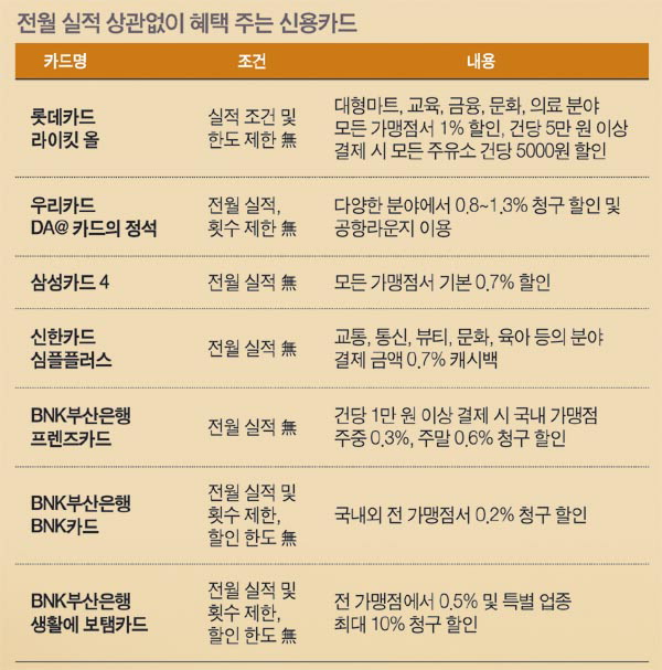 ½Å¿ëÄ«µåÀÇ ¹«ºÐº°ÇÑ »ç¿ëÀº °ú¼Òºñ¿Í ½Å¿ëºÒ·®À¸·Î À̾îÁø´Ù. ÇÏÁö¸¸ ÇýÅÃÀ» ²Ä²ÄÈ÷ µûÁ®¼ Àß »ç¿ëÇÑ´Ù¸é ÀǿܷΠ¸¹Àº °÷¿¡¼ µ·À» Àý¾àÇÒ ¼ö ÀÖ´Ù. ½Å¿ëÄ«µåÀÇ ÇýÅÃÀ» ¹Þ°íÀÚ ÇÑ´Ù¸é °¡Àå ¸ÕÀú ½Å°æ ½á¾ß ÇÒ ºÎºÐÀÌ ¹Ù·Î Àü¿ù ½ÇÀûÀÌ´Ù. ´ëºÎºÐÀÇ ½Å¿ëÄ«µå°¡ Àü¿ù ½ÇÀû ¶Ç´Â ÇýÅà Àû¿ë Ƚ¼ö µî Á¶°ÇÀÌ ÃæÁ·µÅ¾ß žÀçµÈ ¼ºñ½º ÇýÅÃÀ» ÁØ´Ù. ±×·±µ¥ ÀǿܷΠÀü¿ù ½ÇÀûÀ̳ª ÀÌ¿ë ÇýÅà Àû¿ë Çѵµ¡¤È½¼ö µî Á¶°Ç¿¡ »ó°ü¾øÀÌ ÇÒÀÎ ÇýÅÃÀ» Á¦°øÇÏ´Â ½Å¿ëÄ«µåµµ ÀÖ´Ù.