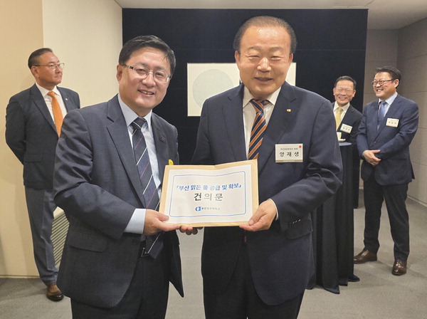 1ÀÏ ´ëÇÑ»ó°øÈ¸ÀǼҿ¡¼ ¿¸° ¡®±è¼ºÈ¯ ±âÈÄ¿¡³ÊÁöȯ°æºÎ Àå°ü ÃÊû CEO Á¶Âù °£´ãȸ¡¯¿¡¼ ¾çÀç»ý ºÎ»ê»óÀÇ È¸ÀåÀÌ ±è Àå°ü¿¡°Ô ¡®ºÎ»ê ¸¼Àº ¹° È®º¸ °ü·Ã °ÇÀǼ¡¯¸¦ Àü´ÞÇÑ ÈÄ ±â³ä ÃÔ¿µÀ» Çϰí ÀÖ´Ù. ºÎ»ê»óÀÇ Á¦°ø |