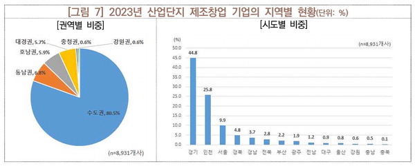 9ÀÏ Çѱ¹»ê¾÷´ÜÁö°ø´ÜÀÌ ÃÖ±Ù ¹ßÇ¥ÇÑ ¡®»ê¾÷´ÜÁö Á¦Á¶Ã¢¾÷ ±â¾÷ÀÇ ÇöȲ ¹× Ư¼º ºÐ¼®°ú ½Ã»çÁ¡¡¯ º¸°í¼¿¡ µû¸£¸é, 2023³â ±âÁØ Àü±¹ »ê´Ü¿¡ ÀÖ´Â Á¦Á¶Ã¢¾÷ ±â¾÷ ¼ö´Â 8931°³·Î ÀÌ Áß 80.4%ÀÎ 7190°³ »ç°¡ ¼¿ï °æ±â ÀÎõ µî ¼öµµ±Ç¿¡ ÀÚ¸®¸¦ Àâ¾Ò´Ù. Á¦Á¶Ã¢¾÷±â¾÷Àº ¡®Áß¼Ò±â¾÷â¾÷Áö¿ø¹ý¡¯¿¡ µû¶ó »ç¾÷À» °³½ÃÇÑ ³¯·ÎºÎÅÍ 7³âÀÌ Áö³ªÁö ¾ÊÀº Áß¼Ò±â¾÷À¸·Î ºÐ·ùµÈ´Ù.