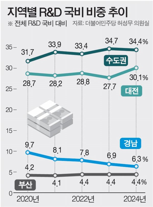 Á¤ºÎ°¡ ÁýÇàÇÏ´Â Àüü ¿¬±¸°³¹ß(R&D) ±¹ºñÀÇ 65% Á¤µµ°¡ ¼öµµ±Ç 3°³ ½Ã¡¤µµ(¼¿ï °æ±â ÀÎõ)¿Í ´ëÀü¿¡ ÁýÁߵŠÀÖ´Ù´Â ÁöÀûÀÌ Á¦±âµÆ´Ù.
