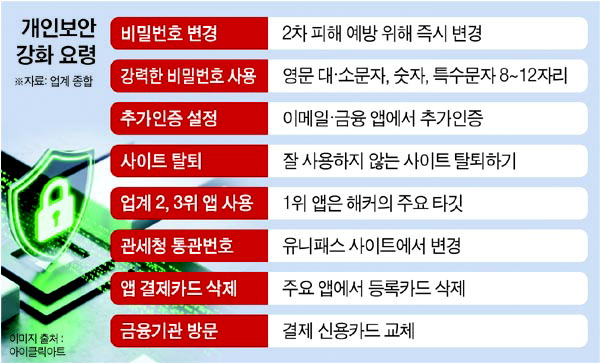 ÇÇÇØ¸¦ ¸·±â À§Çؼ­´Â ºñ¹Ð¹øÈ£ºÎÅÍ ¹Ù²ã¾ß ÇÑ´Ù. °¡Àå ±âº»ÀûÀ̰í Áß¿äÇÑ º¸¾È ¹æ½ÄÀÌ´Ù. ÄíÆÎÀ» Æ÷ÇÔÇØ °¢Á¾ »çÀÌÆ® ºñ¹Ð¹øÈ£¸¦ µ¿ÀÏÇÏ°Ô ¼³Á¤Çß´Ù¸é ¸ðµÎ º¯°æÇÑ´Ù. ƯÈ÷ ±ÝÀ¶±â°ü, À̸ÞÀÏ, ¼îÇθô ºñ¹Ð¹øÈ£¸¦ ¸ðµÎ ¹Ù²Û´Ù. À̹ø ÄíÆÎ »çÅ¿¡¼­´Â ¾ÆÆÄÆ® ÃâÀÔ±¸ ºñ¹Ð¹øÈ£µµ ³ëÃâµÆ±â ¶§¹®¿¡ ÃâÀÔ±¸ ºñ¹Ð¹øÈ£ º¯°æµµ ¿ä±¸ÇÑ´Ù.