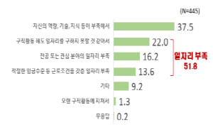 À̵éÀÌ Àû±ØÀûÀ¸·Î ±¸Á÷Ȱµ¿À» ÇÏÁö ¾Ê´Â °¡Àå Å« ÀÌÀ¯·Î´Â ÀÚ½ÅÀÇ ¿ª·®¡¤±â¼ú¡¤Áö½Ä ºÎÁ·¿¡ µû¸¥ Ãß°¡ Áغñ(37.5%)°¡ ²ÅÇû´Ù. ±¸Á÷Ȱµ¿À» ÇØµµ ÀÏÀÚ¸®¸¦ ±¸ÇÏÁö ¸øÇÒ °Í °°¾Æ¼­(22.0%), Àü°ø ¶Ç´Â °ü½É ºÐ¾ßÀÇ ÀÏÀÚ¸® ºÎÁ·(16.2%), ÀûÇÕÇÑ ÀÓ±Ý ¼öÁØ µî ±Ù·ÎÁ¶°ÇÀ» °®Ãá ÀÏÀÚ¸® ºÎÁ·(13.6%)À» ²Å¾Ò´Ù. ÀÀ´ä Çлý Àý¹Ý ÀÌ»ó(51.8%)ÀÌ ¡®ÀÏÀÚ¸® ºÎÁ·¡¯À» ¹®Á¦·Î ÁöÀûÇÑ ¼ÀÀÌ´Ù.