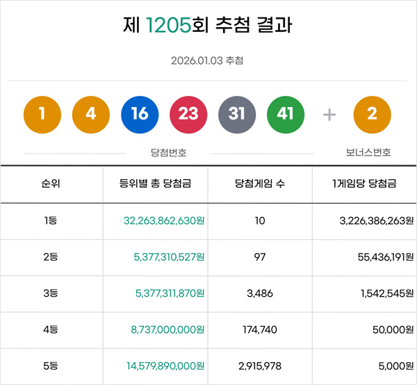 Á¦1205ȸ ·Î¶Çº¹±Ç Ãß÷¿¡¼ ¡®1, 4, 16, 23, 31, 41¡¯ÀÌ 1µî ¹øÈ£·Î »ÌÇû´Ù. 2µî º¸³Ê½º ¹øÈ£´Â ¡®2¡¯´Ù.