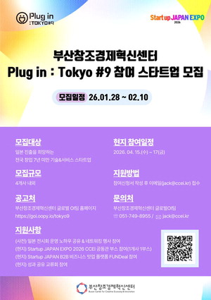 ºÎ»êâ°æÀº ÀϺ» ½ÃÀå ÁøÃâÀ» Èñ¸ÁÇÏ´Â ½ºÅ¸Æ®¾÷À» ´ë»óÀ¸·Î ¡®Ç÷¯±× ÀÎ µµÄì(Plug in: Tokyo) #9¡¯ ÇÁ·Î±×·¥ Âü¿©±â¾÷À» ¸ðÁý(Æ÷½ºÅÍ)ÇÑ´Ù°í 3ÀÏ ¹àÇû´Ù. À̹ø ÇÁ·Î±×·¥Àº ¿À´Â 4¿ù 15~17ÀÏ ÀϺ» Ä¡¹Ù ¸¶ÄíÇϸ® ¸ä¼¼¿¡¼ ¿¸®´Â ¡®½ºÅ¸Æ®¾÷ ÀçÆÒ ¿¢½ºÆ÷(Startup JAPAN EXPO) 2026¡¯¿¡ ½ºÅ¸Æ®¾÷ ºÎ½º¸¦ ¸¶·Ã, ÇöÁö ½ÃÀå°úÀÇ Á¢Á¡À» È®´ëÇϱâ À§ÇØ ±âȹµÆ´Ù.