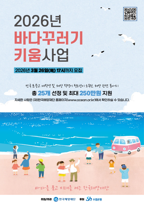 26ÀÏ Çѱ¹ÇؾçÀç´ÜÀº ¡®2026³â ¹Ù´Ù²Ù·¯±â Ű¿ò »ç¾÷¡¯ Âü°¡ÀÚ¸¦ °ø¸ðÇÑ´Ù´Â ÀÏÁ¤À» ¸¶·ÃÇß´Ù. ´ë»óÀº Àü±¹ ÃÊ¡¤Áß¡¤°íµîÇб³ ÀçÇлý ¹× ÇØ´ç Çзɱâ û¼Ò³â 5ÀÎ ÀÌ»óÀÌ´Ù. ´Ü µ¿¾Æ¸®¿¡´Â Áöµµ±³»ç³ª ¼ºÀΠåÀÓÀÚ°¡ 1¸í ÀÌ»ó Æ÷ÇÔµÅ¾ß ÇÑ´Ù.