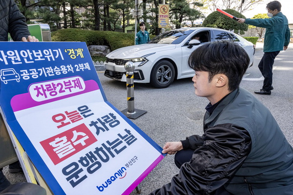 7ÀÏ ºÎ»ê ºÎ»êÁø±¸Ã» ÀÔ±¸¿¡¼­ °ü°èÀÚµéÀÌ °ø°ø±â°ü Â÷·® 2ºÎÁ¦ ½ÃÇà ¾È³»¹®À» ¼³Ä¡Çϰí ÀÖ´Ù. Â÷·® 2ºÎÁ¦´Â ÀÚ¿ø¾Èº¸À§±â ¡®°æ°è¡¯ ´Ü°è ¹ß·É¿¡ µû¶ó ¿¡³ÊÁö ¼ö¿ä¸¦ ÁÙÀ̱â À§ÇØ ½ÃÇàµÈ´Ù. ÀÌ¿øÁØ ±âÀÚ windstorm@kookje.co.kr