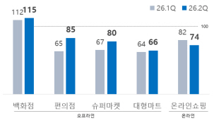 ´ëÇÑ»ó°øÈ¸ÀǼҴ ¼Ò¸ÅÀ¯Åë¾÷ü 500°³»ç¸¦ Á¶»çÇÑ 2026³â 2ºÐ±â ¼Ò¸ÅÀ¯Åë¾÷ °æ±âÀü¸ÁÁö¼ö(RBSI) Àü¸ÁÄ¡°¡ ¿ÃÇØ 1ºÐ±â(79)¿Í ºñ½ÁÇÑ 80À» ±â·ÏÇß´Ù°í 19ÀÏ ¹àÇû´Ù. RBSI´Â 100À» ±âÁØÀ¸·Î ±× ÀÌ»óÀÌ¸é ´ÙÀ½ ºÐ±â °æ±â¸¦ ±àÁ¤ÀûÀ¸·Î, ±× ¹Ì¸¸ÀÌ¸é ºÎÁ¤ÀûÀ¸·Î Àü¸ÁÇÏ´Â ±â¾÷ÀÌ ¸¹´Ù´Â Àǹ̴Ù.