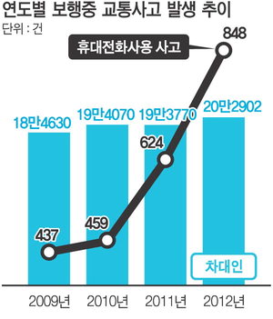 ±³Åë¾ÈÀü°ø´ÜÀÌ '½º¸¶Æ®Æù »ç¿ëÀÌ º¸Çà¾ÈÀü¿¡ ¹ÌÄ¡´Â À§Ç輺 ¿¬±¸'¸¦ ¼öÇàÇØ 11ÀÏ ¹ßÇ¥ÇÑ °á°ú º¸Çà µµÁß ½º¸¶Æ®ÆùÀ» »ç¿ëÇÏ´Ù°¡ »ç°í°¡ ¹ß»ýÇÑ °Ç¼ö´Â 2009³â 437°Ç¿¡¼ 2010³â 459°ÇÀ¸·Î ´Ã¾ú°í 2011³â 624°Ç, 2012³â¿¡´Â 848°ÇÀ¸·Î ±ÞÁõÇÑ °ÍÀ¸·Î Á¶»çµÆ´Ù. Á¶»ç °á°ú ÀϹݺ¸µµ¿¡¼ÀÇ À§ÇèÇൿ(À½¾Ç µè±â, ¹®ÀÚ¸Þ½ÃÁö º¸³»±â) ºñÀ²Àº »ç¿ëÀÚ ¿¬·ÉÃþÀÌ ³·À»¼ö·Ï ³ô¾Ò´Ù.