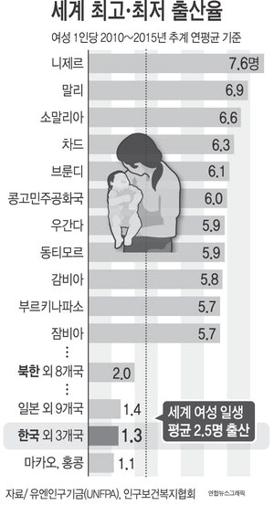 Çѱ¹ÀÇ 2010~2015³â Ãß°è ¿¬Æò±Õ Ãâ»êÀ²(¿©¼º 1Àδç)Àº 1.3¸íÀ¸·Î ¸¶Ä«¿À¡¤È«Äá(ÀÌ»ó 1.1¸í)¿¡ À̾î 3¹øÂ°·Î ³·¾Ò´Ù. ÃÖ°í Ãâ»êÀ² ±¹°¡´Â ´ÏÁ¦¸£(7.6¸í)¿´°í, ¼¼°è¿©¼ºµéÀº ÀÏ»ý¿¡¼ Æò±Õ 2.5¸íÀÇ ¾ÆÀ̸¦ ³º´Â °ÍÀ¸·Î Á¶»çµÆ´Ù.