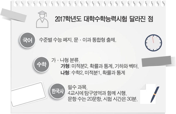 2017Çг⵵ ´ëÇмöÇдɷ½ÃÇèÀº 2016Çг⵵ ¼ö´É°ú ¹üÀ§°¡ ´Ù¸£´Ù. 2007³â°ú 2009³â °³Á¤ ±³À°°úÁ¤ °£ Â÷ÀÌ ¶§¹®ÀÌ´Ù. ÀÌ¿Í ÇÔ²² Çѱ¹»ç°¡ Çʼö °ú¸ñÀ¸·Î ¹Ù²î°í ±¹¾î A¡¤BÇü ÅëÇÕÀ̶ó´Â ¿ÜºÎ º¯¼ö°¡ Á¸ÀçÇÑ´Ù. ¹°·Ð Çѱ¹»ç Çʼö°¡ Ãʱ⠿ì·Á¿Í °°ÀÌ ÇлýµéÀÇ ÇнÀ ºÎ´ãÀ» Áõ°¡½ÃŰÁö´Â ¾ÊÀ» °ÍÀ¸·Î º¸ÀÌ°í ±¹¾î A¡¤BÇü ÅëÇÕÀÌ ÀԽà ÁöÇüÀ» Èçµé Á¤µµÀÇ º¯¼ö´Â ¾Æ´ÏÁö¸¸, ¼ö½Ã¸ðÁýÀÇ ¼ö´É ÃÖÀúÇз±âÁØ¿¡¼´Â ¾î´À Á¤µµ º¯¼ö·Î ÀÛ¿ëÇÒ °¡´É¼ºÀÌ Å©´Ù. ¹®¡¤À̰ú ¸ðµÎ ¼öÇÐ ¹üÀ§³ª ¹Ý¿µ ºñÀ²¿¡µµ º¯È°¡ ÀÖ´Ù. ¼öÇè»ýÀÌ ¾Ë¾Æ¾ß ÇÒ 2017Çг⵵ ´ëÀÔ Á¤Ã¥ÀÇ º¯È¿Í ¿µ¿ªº° ÇнÀ¹ýÀ» ¤¾îºÃ´Ù.