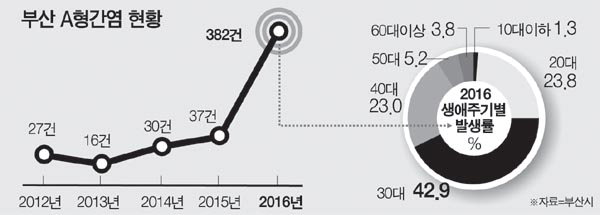 ºÎ»ê½Ã´Â Áö³ÇØ ºÎ»ê¿¡¼ ¹ß»ýÇÑ AÇü °£¿° ȯÀÚ ½Å°í °Ç¼ö°¡ 2015³âÀÇ 37°Çº¸´Ù 10¹è ¸¹Àº 382°ÇÀ¸·Î Áý°èµÆ´Ù°í 12ÀÏ ¹àÇû´Ù. 2013³â(13°Ç)°ú 2014³â(30°Ç)¿¡ ºñÇØ¼µµ ¸¹ÀÌ ´Ã¾î³ ¼öÄ¡´Ù.