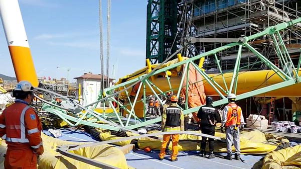 À̳¯ »ç°í´Â 7¾Èº®¿¡ ÀÖ´ø 800t±Þ °ñ¸®¾Ñ Å©·¹Àΰú Ÿ¿öÅ©·¹ÀÎÀÌ Ãæµ¹ÇÏ¸é¼ Å¸¿öÅ©·¹ÀÎ ºÕ´ë°¡ ¹«³ÊÁ® ³»¸° °ÍÀ¸·Î »ï¼ºÁß°ø¾÷Àº ÆÄ¾ÇÇϰí ÀÖ´Ù. Ÿ¿öÅ©·¹Àο¡¼ Áß·®¹°À» ¿î¹ÝÇÏ´Â ¼öÆòÀ¸·Î ±æ°Ô »¸Àº ºÕ´ë°¡ °ñ¸®¾Ñ Å©·¹Àΰú ºÎµúÈ÷¸é¼ ¹ß»ýÇÑ °ÍÀ¸·Î ¾Ë·ÁÁ³´Ù.